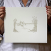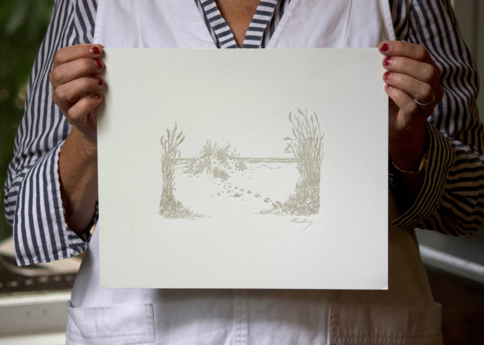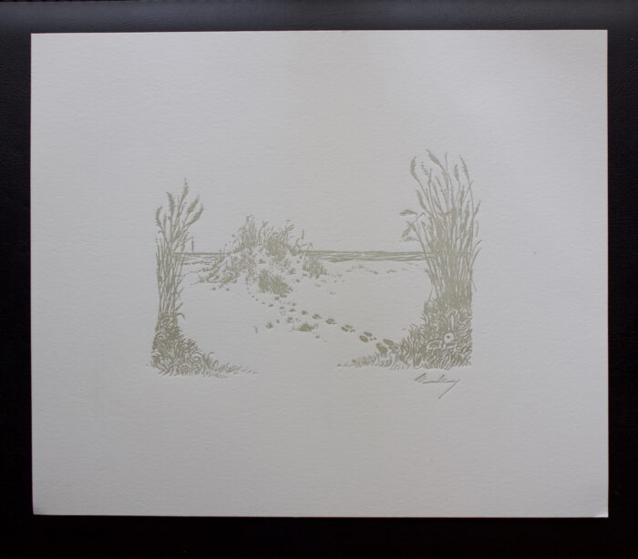 An elusive little bunny leaves only footprints in the sand. A perfectly charming scene for your beach house! Featuring original artwork signed by artist, Ella Wherry. Printed with a vintage letterpress in Beige Ink on luxury 110 lb, 100% cotton, Pearl White card stock. The print measures 13″ x 17.” Shipped flat.