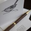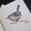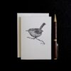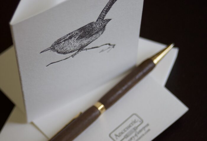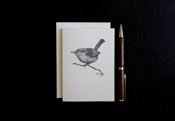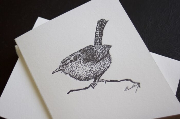 The Carolina Wren sings a sweet tune! Cheerful boxed set includes 8 folded notes with matching envelopes. Featuring new commissioned artwork by Ella Wherry, individually printed on an antique letterpress in Onyx Black ink. Luxurious, 100% cotton, 110lb card stock in Pearl White. Sized 3 1/2″ x 4 7/8″. Arrives in a crystal clear box showcasing each beautiful detail.