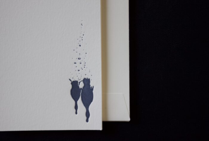 These adorable Note Cards will dive into your heart! Playful boxed set includes 6 notes with matching envelopes. Featuring new commissioned artwork by Ella Wherry, individually printed on an antique letterpress in Night Blue ink. Luxurious, 100% cotton, 110lb card stock in Ecru White. Sized 3 7/8″ x 9 1/4″. Arrives in a crystal clear package showcasing each beautiful detail.