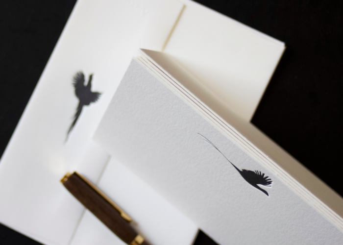 This tasteful gift will have you “flying high.” Luxury boxed set of 6 flat notes featuring our graceful pheasant in Onyx Black Ink, original artwork by Ella Wherry, commissioned exclusively for Ancesserie. Hefty 220#, 100% cotton, pearl white card stock makes quite an impression when paired with a matching envelope featuring original pheasant artwork, letterpress printed again on the square flap.  Arrives in a crystal clear box showcasing each beautiful detail.  Generous note size: 4.6″ x 6.25″.