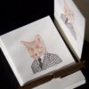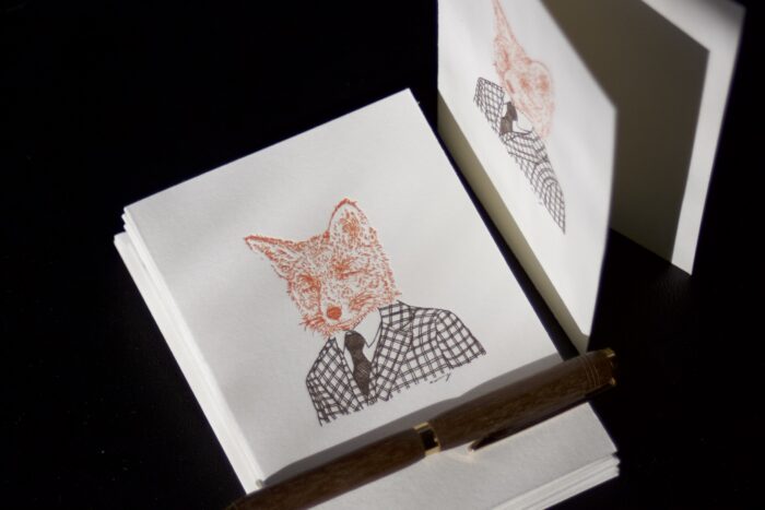 Our dapper Fox Note Cards make a handsome gift. Boxed set includes 8 folded notes with matching envelopes. Featuring new commissioned artwork by Ella Wherry, individually printed on an antique letterpress in Cocoa Brown and Red Fox inks. Luxurious, 100% cotton, 110lb card stock in Pearl White. Sized 3 1/2″ x 4 7/8″. Arrives in a crystal clear box showcasing each beautiful detail.