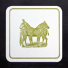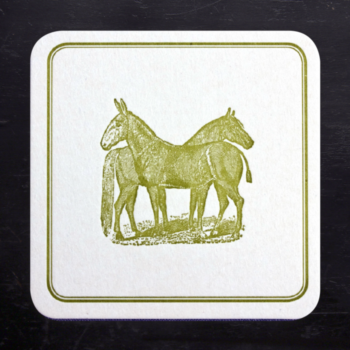 Colorful “Companions.” Choose from a set of 9 or box of 50 horse and mule coasters, each individually printed with chartreuse green ink on a vintage letterpress using a late 19th Century engraving.