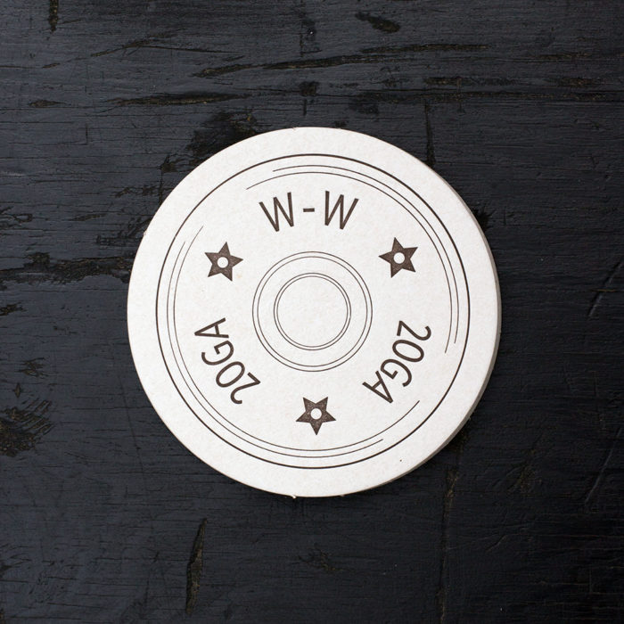 Coasters come in sets of 9 or 50, sized at 4″. Round heavyweight boardstock is 2mm thick, durable and holds moisture. Allow to air dry for multiple uses. Hand crafted in the USA. Please allow up to 3 business days to process and ship your order. Arrives in a box with sticker label.