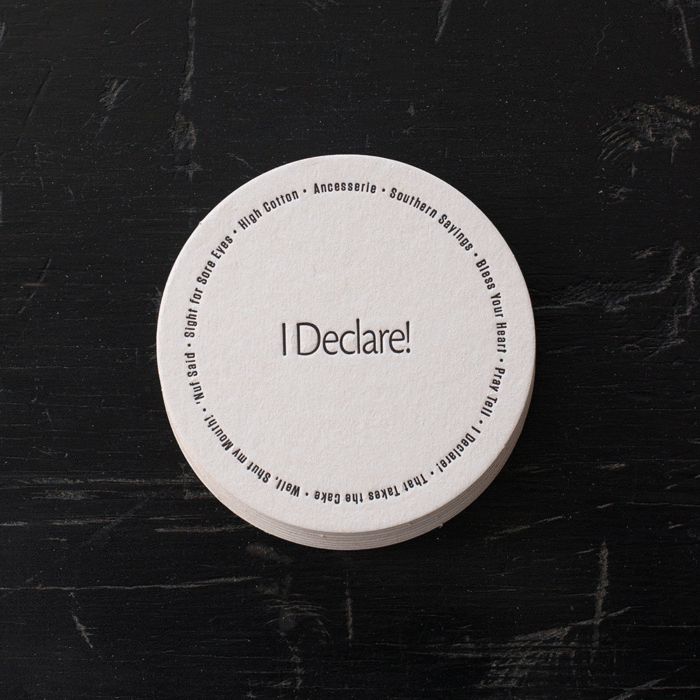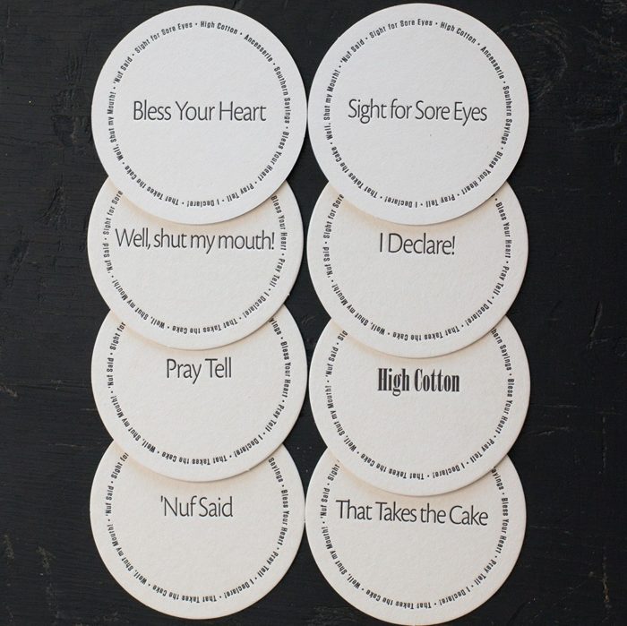Our favorite Southern Sayings, now in water absorbent letterpress coasters. Assorted set of 8 coasters, each featuring a Southern Saying surrounded by the entire collection. Fun for a party, hostess gift, everyday…so many fun ways to use these. A great conversation starter. Or stock up for your special event or to have on hand with a box of 48!
