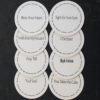 Coasters come in a boxed set of 48, sized at 4″. Round heavyweight boardstock is 2mm thick, durable and holds moisture. Allow to air dry for multiple uses. Hand crafted in the USA. Please allow up to 3 business days to process and ship your order. Arrives in a box with sticker label.