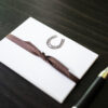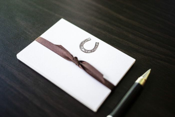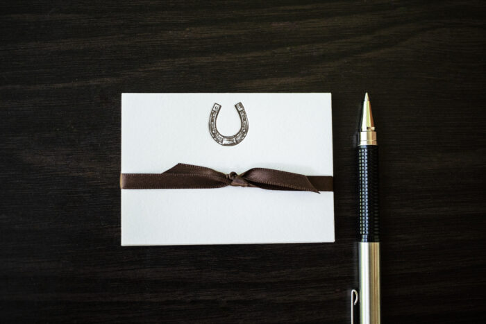 A tradition for good luck, these Horseshoe note cards are sure to liven up your special event or brighten someone’s day! Petite cards are individually printed with a vintage letterpress on luxury 100% cotton cardstock. Original artwork in Cocoa ink. Generously sized at 3 1/2″ x 2 1/2.″ Sold in packets of 10, boxes of 50, with NEW option to add matching little envelopes.