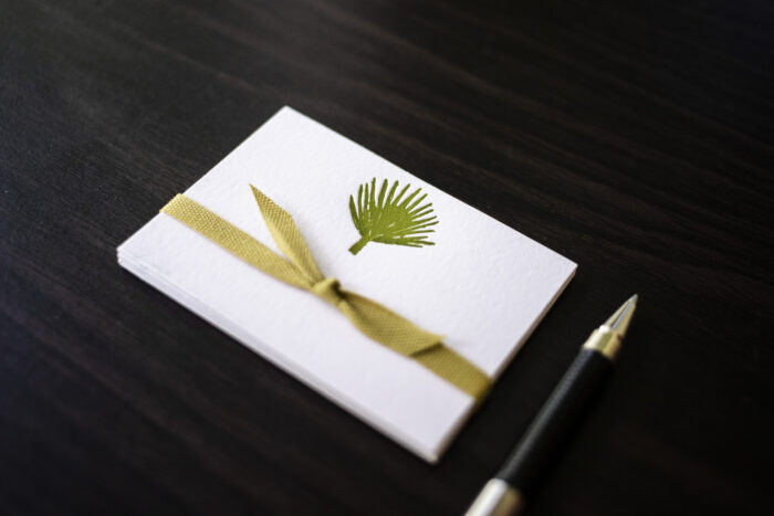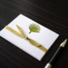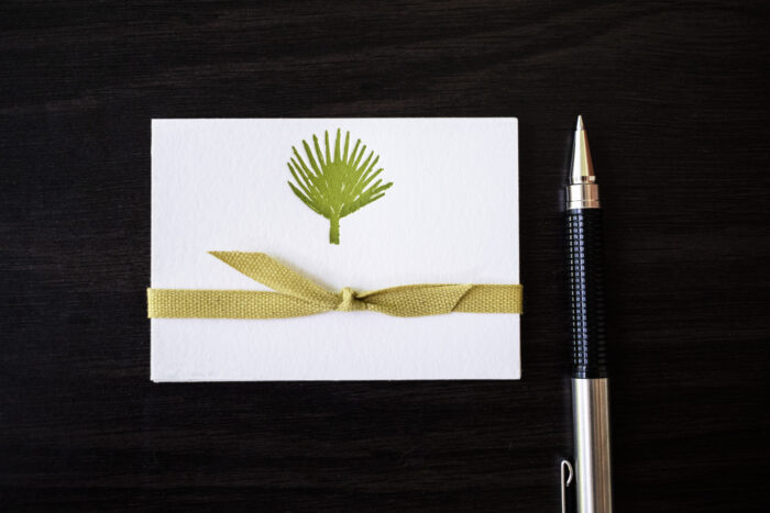Our new Palm Frond place cards are a Southern favorite! Individually printed on a vintage letterpress in Chartreuse Green ink on 100% cotton, 110 lb. Pearl White card stock. Cards are generously sized at 3 1/2″ x 2 1/2.″ Sold in packets of 10, boxes of 50, with NEW option to add matching little envelopes.