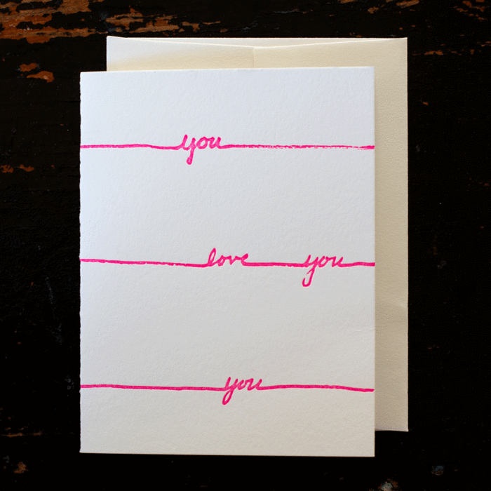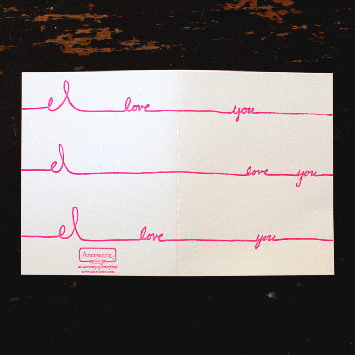 Give a one-of-a-kind, hand-crafted, letterpress card, not found in greeting card isles. Our Hot Pink “Love You 3x” card is made by hand in the USA with as much love as you are sending. Blank within, leaving space for your own loving words. At Ancesserie Letterpress, we believe in preserving American letterpress and the love note. Tell a loved one how you feel with a love card unlike any they have ever received before. Single, folded card printed in Hot Pink ink on 100% cotton, 110 lb. card stock with white kraft envelope. Size 4.25″ x 5.5″.