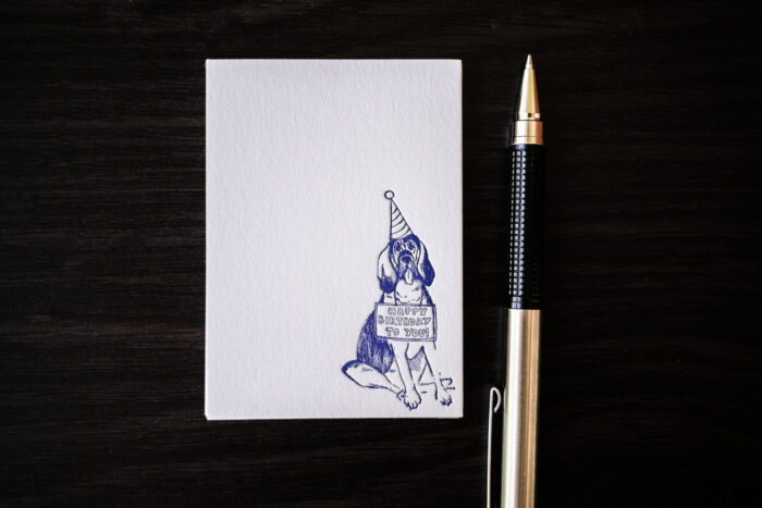 Our Hound Dog is all dressed up and ready to party! Get in the birthday spirit with handmade petite cards, individually printed with a vintage letterpress on luxury 100% cotton cardstock. Original artwork in Cornflower Blue ink. Generously sized at 3 1/2″ x 2 1/2.″ Sold in packets of 10, boxes of 50, with NEW option to add matching little envelopes.