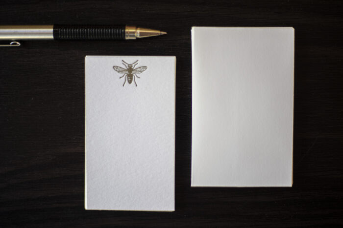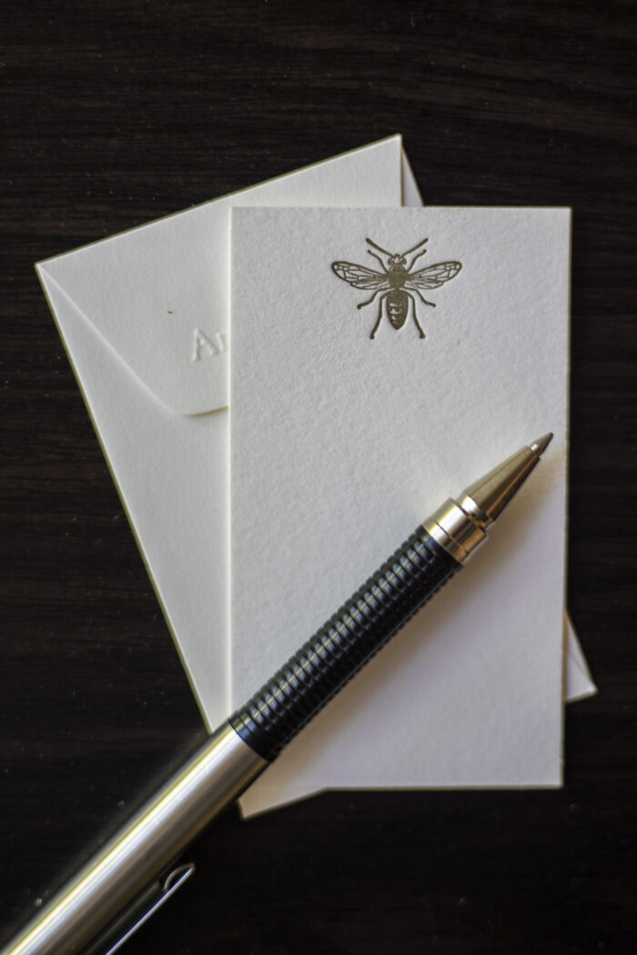 Meet our sparkling Gold Bee Gift Enclosures! Gift Enclosures are individually printed with a vintage letterpress in Early Gold Ink on luxury 100% cotton cardstock. Sized at 2 inches wide for just enough space to write a personalized note and paired with matching envelopes. Created from an early engraving of a worker bee!